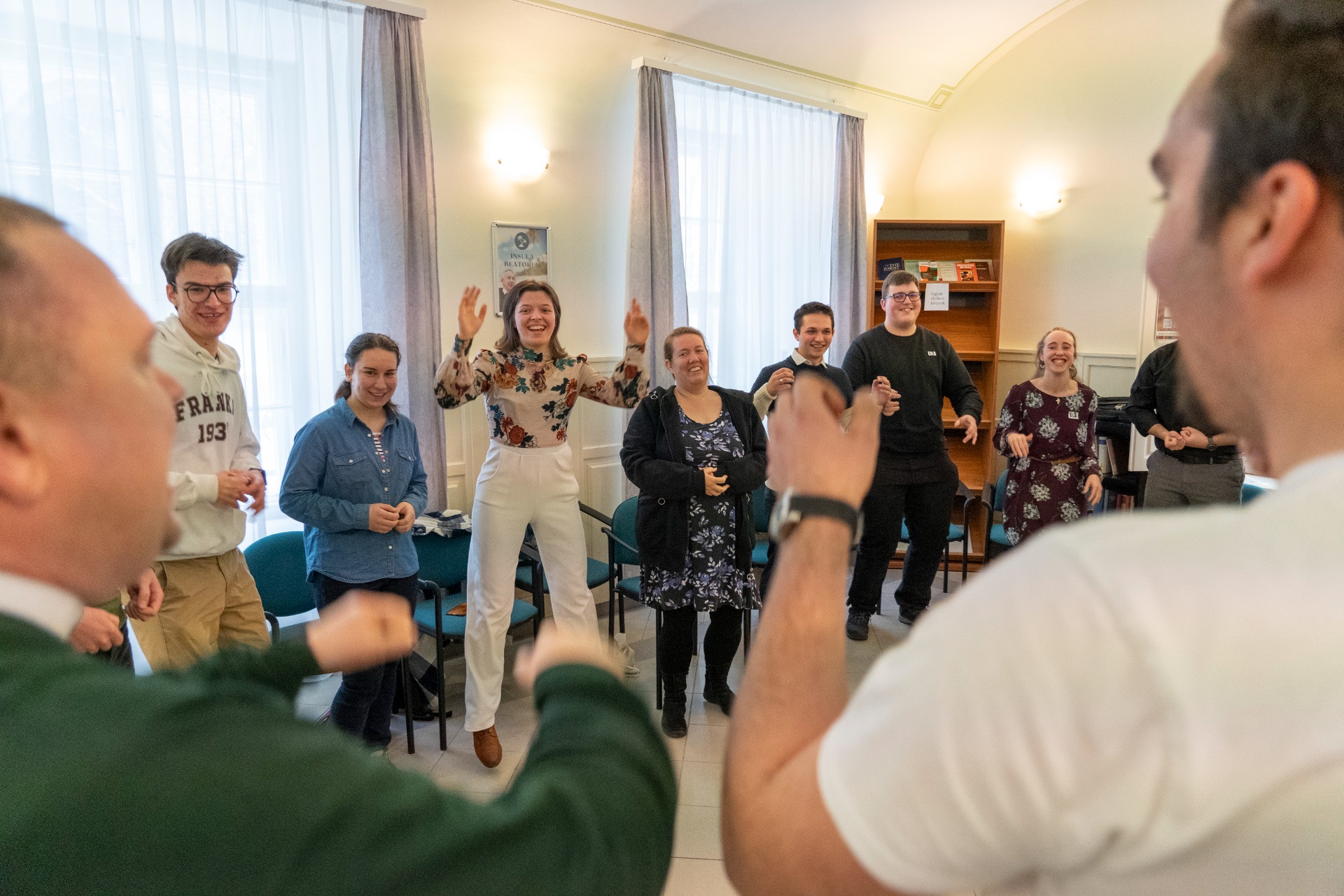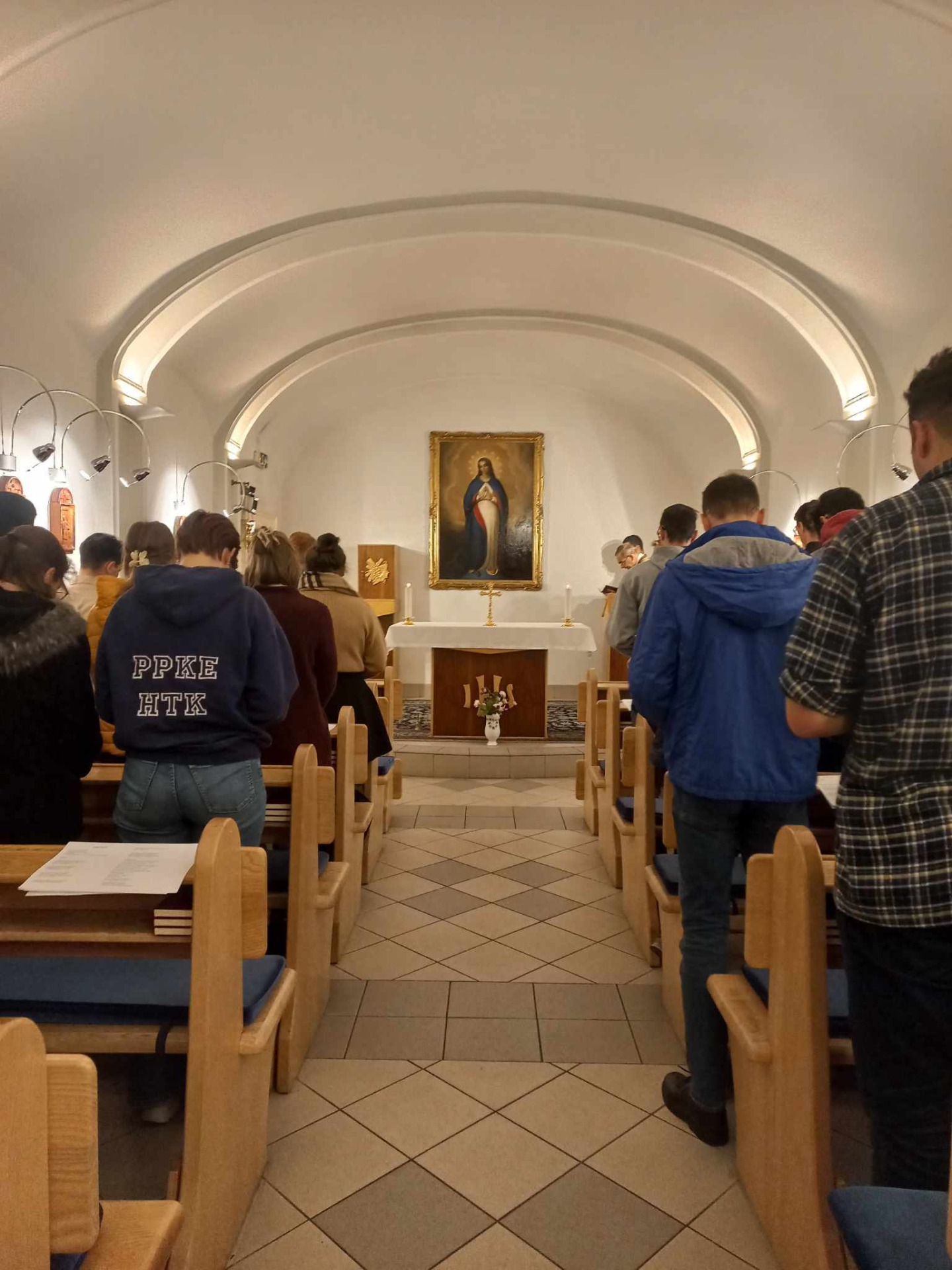 Az első órai szünetben a Hittudományi karhoz méltó módon közös imádsággal indítottuk a napot. A második után pedig a gangra kiállva énekszóval csaltunk egymás arcára mosolyt. Ezt követően 11 órától rövid kincskeresés várt ránk, amelynek köszönhetően jobban megismerhettük az épületet és az itt dolgozó kedves arcokat. A nap zárásaként Kránitz Mihály atya bátorító szavait hallhattuk.